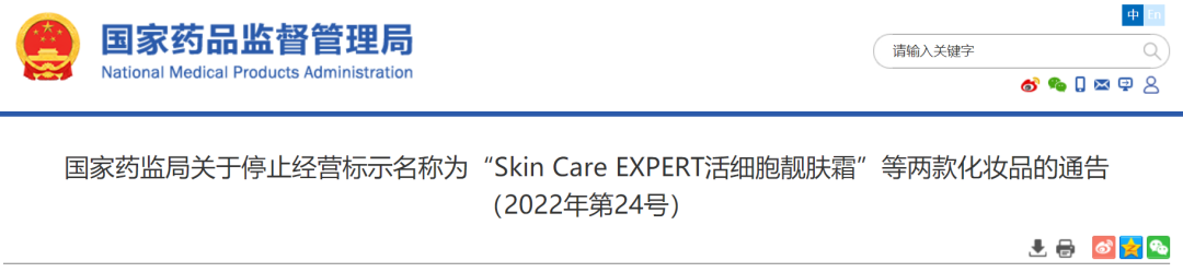 近日,针对化妆品不良反应监测、监督检查发现的问题,国家药监局责成广东省和重庆市药品监督管理局对标示名称为“Skin Care EXPERT活细胞靓肤霜”和“Skin Care EXPERT活细胞靓肤精华”的化妆品进行调查。经查,目前市场上销售的上述两款化妆品未经注册或者备案,其产品标签上标示的“生产企业广州市雅朵生物科技有限公司”和“化妆品生产许可证编号粤妆20180596”为虚假信息,不存在上述化妆品生产企业。 国家药监局 2022年5月12日
