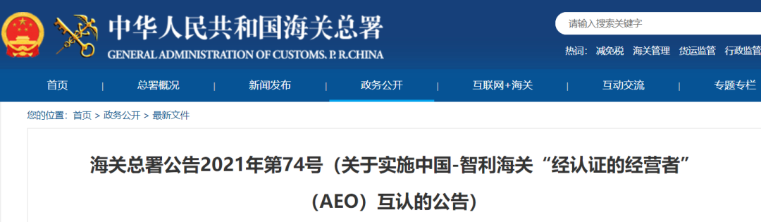 2021年9月25日,海关总署发布2021年第74号公告:中国-智利海关“经认证的经营者”(AEO)互认,自2021年10月8日起正式实施。海关总署公告2021年第74号(关于实施中国-智利海关“经认证的经营者”(AEO)互认的公告)